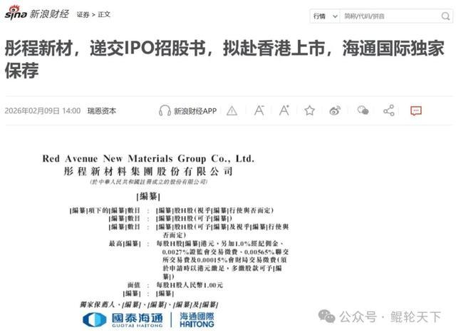 2026年2月8日,A股上市公司“彤程新材”(603650.SH)在港交所递交招股书,拟香港主板IPO上市。