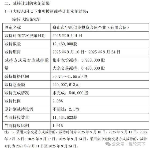 宇彤投资在彤程新材上市初期持股约10%,从2021年到2024年,累计减持约5%股份;2025年又启动新的减持计划,减持约3.33%,减持完成后,其持股比例已降至约1.91%,其中还包括未完成减持540,000 股。据测算,减持累计套现资金约6.59亿元。